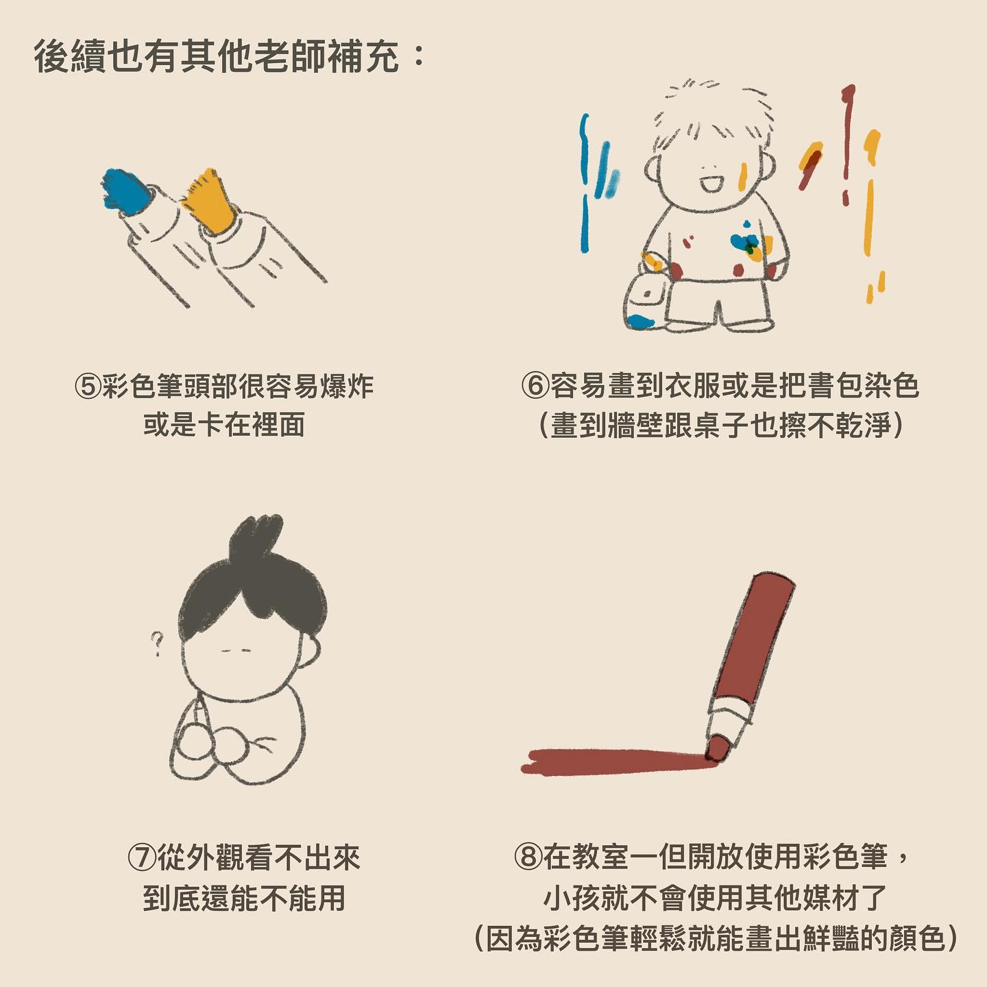 草雞老師發完以上文後,又收到了很多老師、媽媽的回覆,表示彩色筆的缺點不只這些,其他還有: