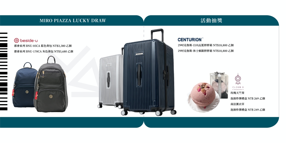 11月25日到12月25日止,凡購買 Miro Piazza 任一產品,就有機會享有 3 重優惠:第一重:線上線下同步全館 8 折,第二重:線上加碼,1+1 一次下單 2 樣商品,優惠疊加到 75 折,還有只要有消費都能參加的第三重加碼旅行好禮抽選:長時間移動與海外旅行必備,好推好走的夢幻逸品 CENTURION 百夫長行李箱,超輕又有專利防盜拉鍊,幫你輕鬆打包各國戰利品。兩天一夜輕旅行、隨時想 Go 就 Go 必備 beside·u 時髦有型的都會系列後揹包,還有,度假不能少的泡澡神器 CLOUD 9 手工香氛泡澡炸彈禮盒,讓天然香氛伴隨著你一起去旅行~