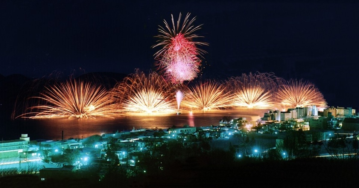 長野縣「諏訪湖祭湖上煙火大會」施放高達約4萬發煙火,數量榮獲日本之首,加上諏訪湖四面環山,煙火施放聲響迴盪山巒環繞的湖畔之間,更是震撼十足!諏訪湖更因身為動畫電影《你的名字。》中的「糸守湖」原型,再次人氣高升,讓這煙火大會聖地變得更加有名。