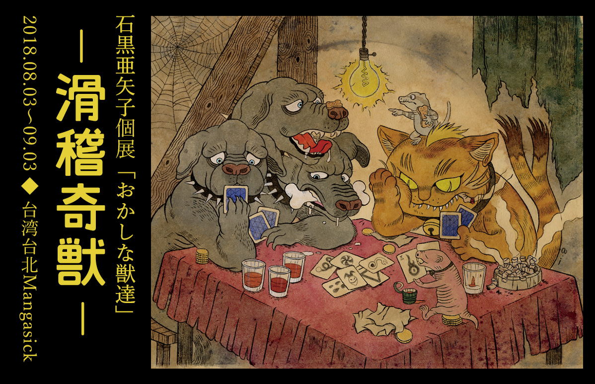 也許有不少人介紹石黑亞矢子小姐給朋友時會補上一句:「她就是《伊藤潤二的貓日記 小四&小六》當中的A子喔。」是的,雖然《伊》書中只提到A子貼網點的功力非常厲害,但石黑小姐其實也是一位以妖怪、架空生物為創作題材的日本畫家、插畫家。在這次的「滑稽奇獸」展,妞妞們可以一睹A子筆下的日式妖怪以及可愛貓咪喲!