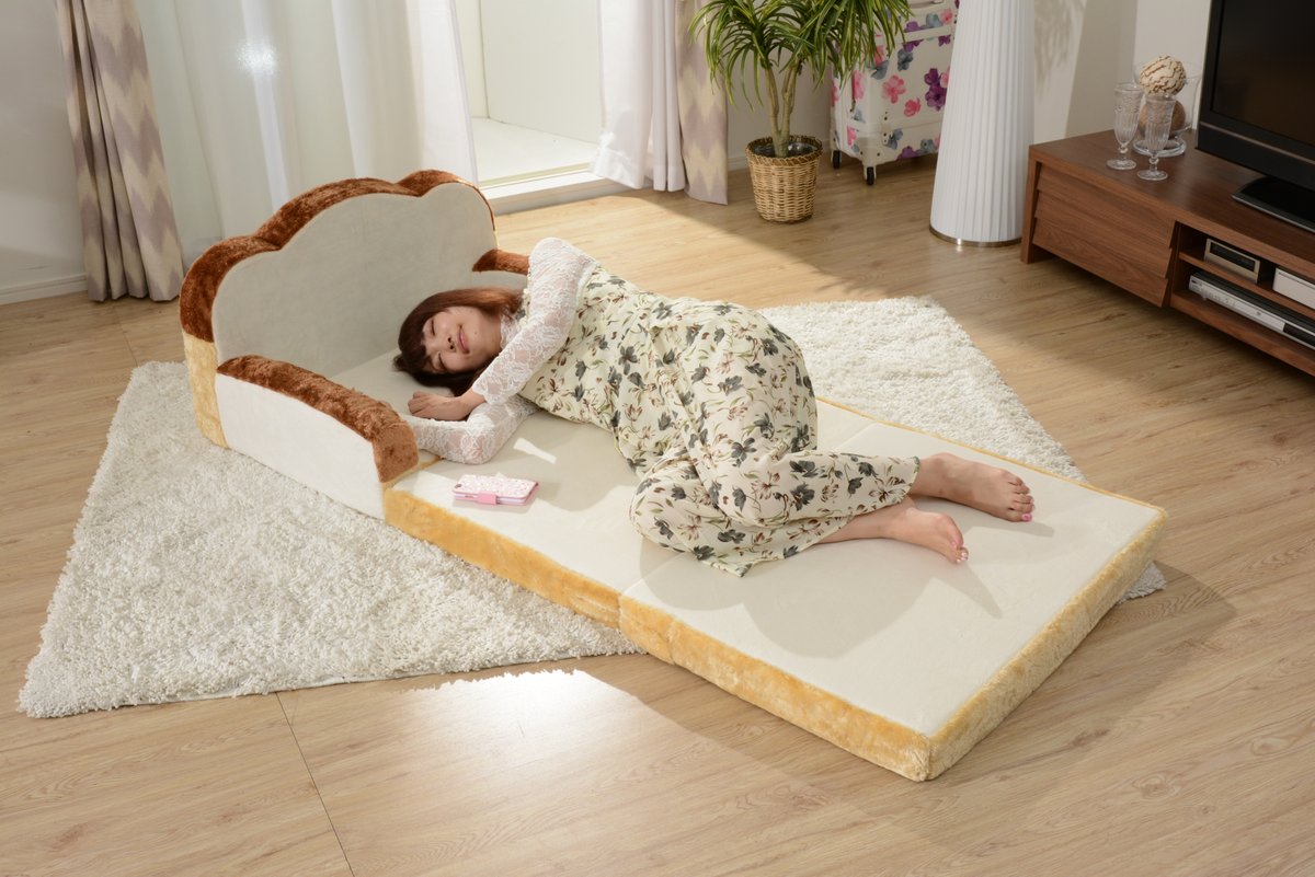 平常可收成「沙發模式」,當要睡覺的時候只要攤開就成了「床舖模式」,不只看起來可口、可愛,還彷彿會飄出吐司香氣般,讓人不自覺就想靠近呢!