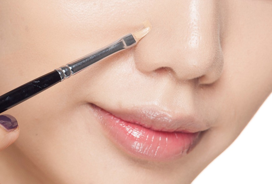 鼻翼容易有暗沉的現象,臉部也會有痘疤、斑點等小瑕疵,這些都會影響底妝的質感,使用筆刷來遮瑕。