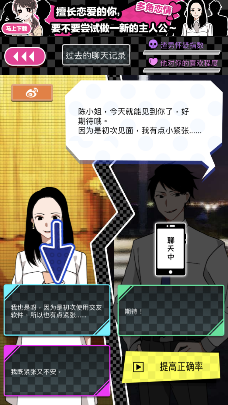 遊戲頁面仿效交友軟體模式,點進去就是女主角在App裡認識的各種男性(XD),而玩家每一次的回答都可能導致不同的結局,所以要慎重回答。如果不確定也可以按下「提高正確率」的選項,讓系統幫助你。