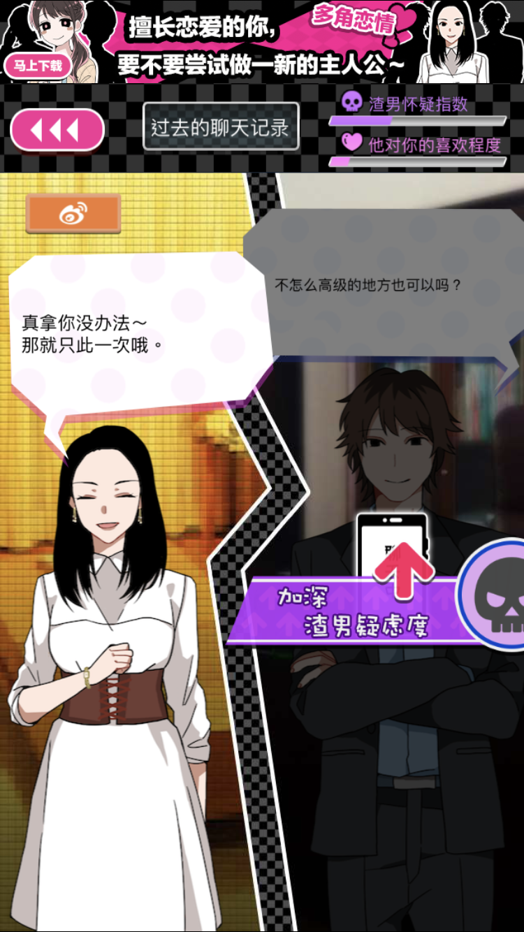 遊戲的右上角會有渣男懷疑度喜歡程度,程度的高低就是要看玩家所選的回答啦!每一次的答案都會影響你們關係的發展方向。