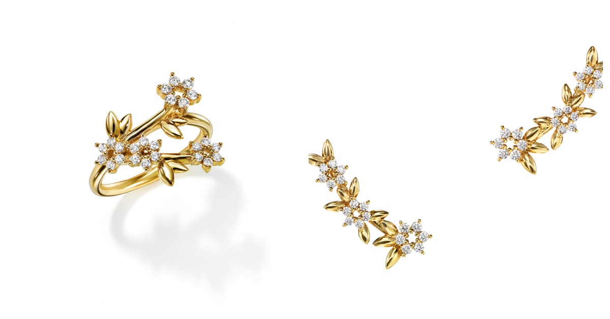 scented系列以不對稱手繪感黃金線條綴以星光鑽石花蕊,抽象地詮釋花朵地嬌柔姿態。精緻小巧的阿古屋珍珠,隨機不經意的排列於花朵之上,為此款清新優雅的珠寶增添了幾分溫柔的光暈。