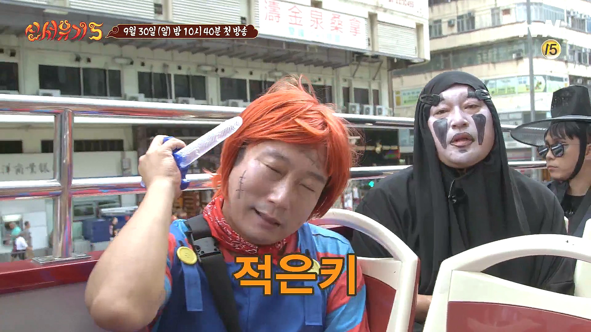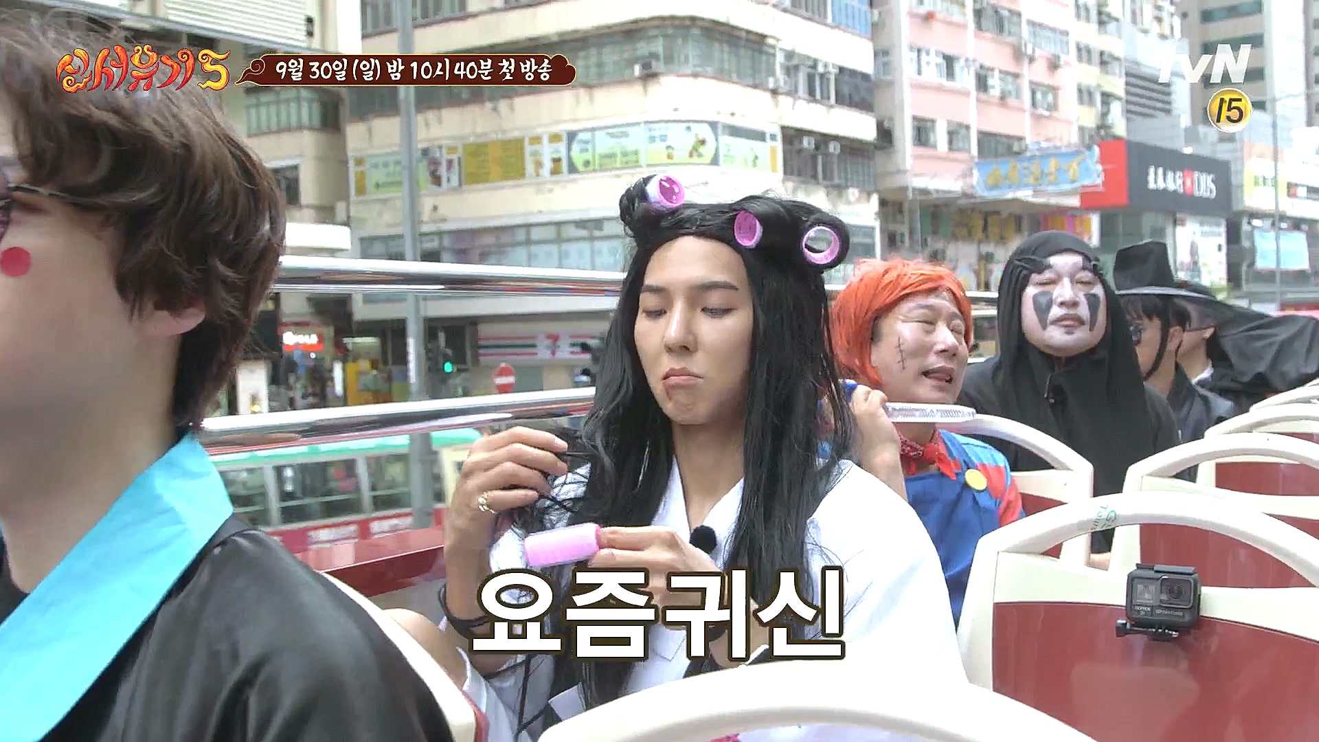 預告中一個個在香港的觀光巴士上公開介紹成員新角色,安宰賢臉上畫上兩個紅點變身帥氣殭屍、最近的常見的「鬼樣」則是由宋旻浩詮釋、拿著玩具小刀的橘髮「恰吉」是李壽根無誤、姜鎬童成為「無臉男」、殷志源拿下墨鏡以黑眼圈超重的「陰間使者」樣貌登場(是業務太多睡不飽嗎XD),而新成員P.O則是以「德古拉吸血鬼」初亮相!(等等!這麼開放的空間不會嚇暈路人嗎XD)