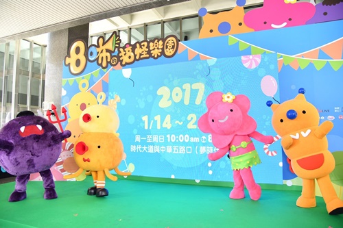 右起主辦單位必應創造、協辦單位高雄市觀光局曾姿雯局長與立法委員賴瑞隆立委一同邀請全台灣的民眾。此外,高雄市政府以及必應創造同時發起「揪愛玩」的公益活動,1月14日開幕當天將邀請300位公益社福團體小朋友與陳菊市長率先暢遊「8咘的搞怪樂園」,透過「8咘的搞怪樂園」的溫馨能量傳遞給每位小朋友。