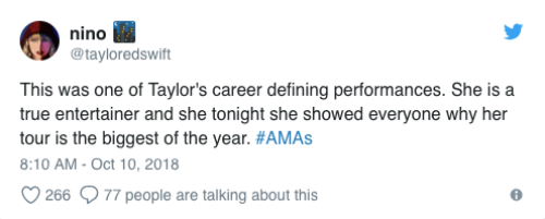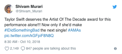 泰勒絲帶著他的吉祥物(?)眼鏡蛇Karyn一起演出專輯中的歌曲《I Did Something Bad》為全美音樂獎開場,整段演出又唱又跳,看得網友們神魂顛倒紛紛大讚「這是泰勒絲最棒的一次演出」、「泰勒絲今晚證明了他會唱、會跳而且他擔下那些說他蛇蠍女的網路攻擊,而且一點都不在乎」!