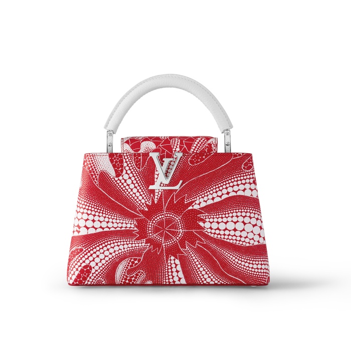 草間彌生的另一個經典便是花朵圖案上,取自1993年加入幾分迷幻元素的畫作《花》,也是大家非常熟悉的南瓜作品的圖紋,在熱賣的Capucines包款上直接以滿版的放大圖案作為設計,也是非常有入手價值的一款!