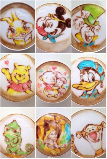 每次喝咖啡,看到漂亮的拉花,都捨不得喝,一定要先替它拍照、欣賞一翻,才喝得下第一口。之前妞新聞提到的超強動漫人物色彩拉花的超強咖啡拉花藝術家Nowtoo Sugi,她高超的拉花技術,讓每一杯咖啡不只好喝,也非常好看,儼然是一幅又一幅的藝術作品!這次要帶妞妞們看到的是迪士尼卡通的拉花,雖然看得到喝不到,還是大飽眼福啦!