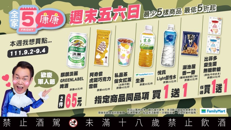 為致敬軍人,全家便利商店在9月2日至9月4日,特選多項商品推出最低5折優惠,陪伴妞妞們度過9月第一個周末,麒麟淡麗GREEN LABEL啤酒兩件特價65元、阿奇儂虎斑巧克力雪糕、私品茶仙女紅茶、FamilyMart Collection生茶、悅氏Light 鹼性水、湖池屋黍一番及比菲多益生菌無糖軟糖,皆享買1送1優惠;此外,9月2日起每周末打開全家App夯品優惠地圖趣,還能查詢附近店鋪優惠相關資訊喔。