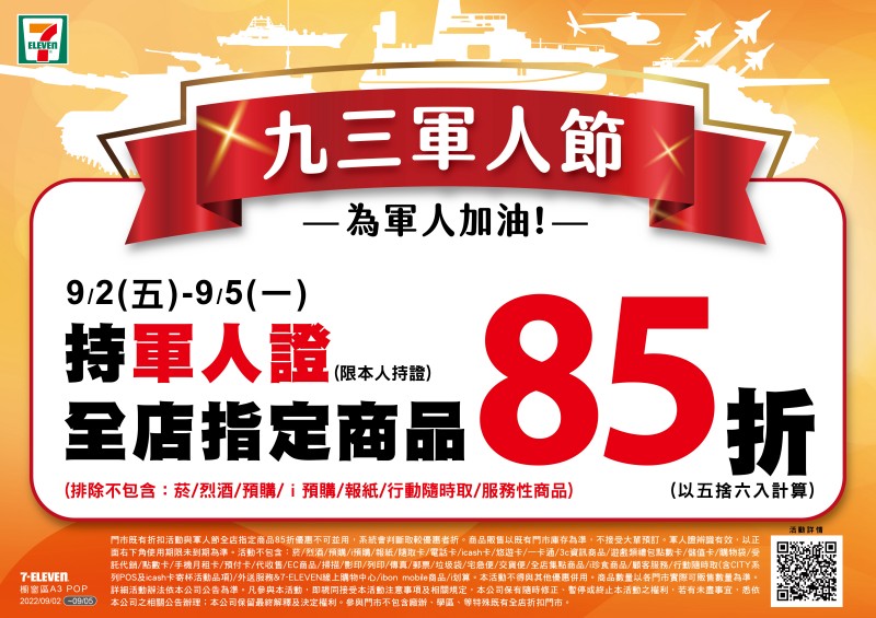 7-ELEVEN也來為軍人加油啦!迎接九三軍人節,7-ELEVEN自9月2日起至9月5日止限時四天,推出軍人節限定優惠,國軍們持軍人證至門市購買指定商品,即可享85折優惠。(限本人持證,不限消費金額與支付工具)
