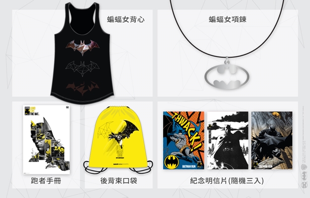 報名成功的跑者將會收到限量版的獨家蝙蝠俠夜跑福袋商品,福袋商品設計將會陸續公布在官網及FB粉專。