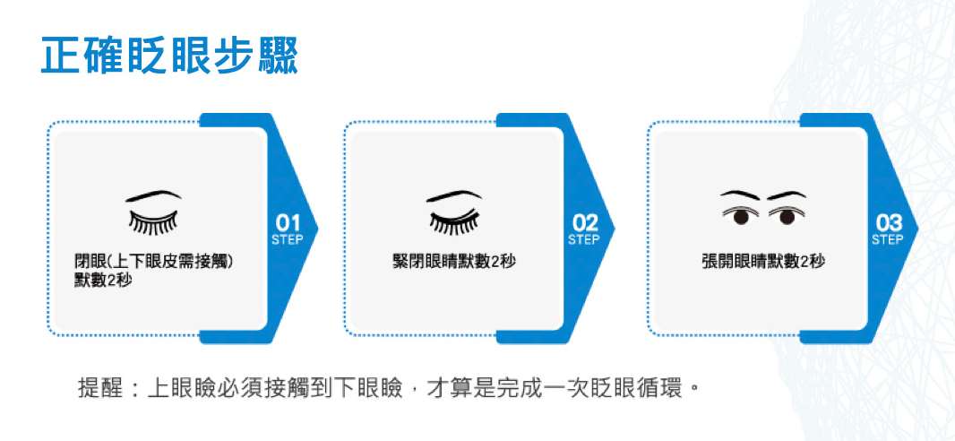 如果屬於輕度乾眼症者,忠孝大學眼科江令楣主任建議,可透過維生素A、C、E攝取、洗臉時清潔睫毛、毛巾熱敷,加上正確眨眼操3部曲:輕輕閉眼、用力緊閉、張開眼睛,記得上眼瞼必須接觸到下眼瞼才算完成一次眨眼循環,每個步驟維持2秒,每天重複5~10次,以緩解不適感,建議可以在每天起床後、睡覺前、三餐前後、使用手機或看電視中的時候進行。若是較難根治的中重症缺油、混合型乾眼症患者,就會建議到眼科由醫師評估,進行專業療程的治療。