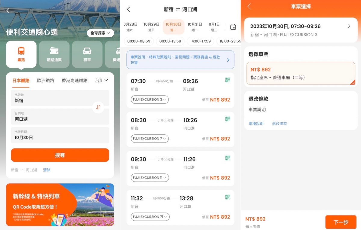 此外一般JR官網僅開放30天前供旅客預訂,而Klook則開放90天前預購,方便海外的我們提早規劃和預訂行程~想要購買富士回遊號車票的旅客,只要選擇出發日期、出發地東京新宿,以及可停靠的目的地如河口湖、下吉田或富士急樂園等,還能近一步挑選欲搭乘的班次和座席。(更多購票資訊請點這裡)
