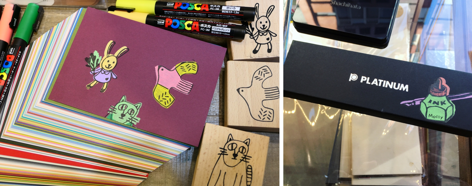 以往這種牛皮紙張的表面,只能用金屬色系或者白色印台來呈現印章線條,但也只能讓線條顏色改變,但有了POSCA之後,即便線條顏色只有黑色,但藉由上色就有不同的美感了。