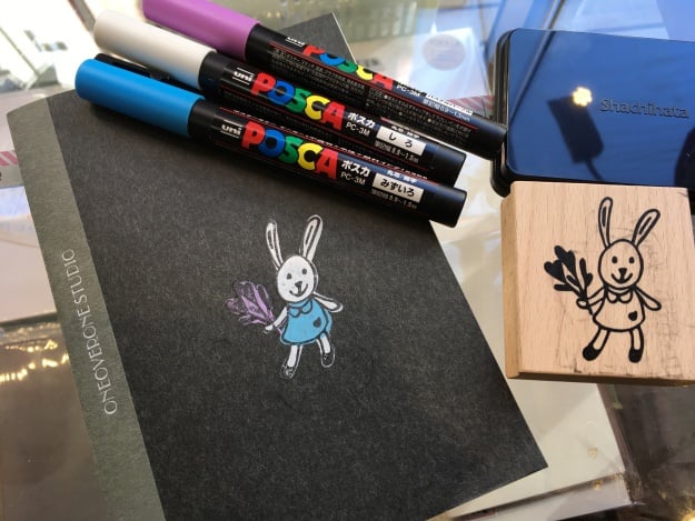 黑色封面一般色筆就沒辦法畫了,且如果要蓋印章也得要改用油性的StazOn白色才行! 但茉莉一樣用POSCA+黑色寫吉達印台來看是否可以搞定,步驟和上面一樣,還是用黑色印台和小島匠所的印章。先用黑色淺淺地蓋上去,只要能看到輪廓就好;接著用白色的POSCA畫兔子身體、藍色畫衣服,等POSCA乾了後,再用印章重新蓋上去,請小心對齊!