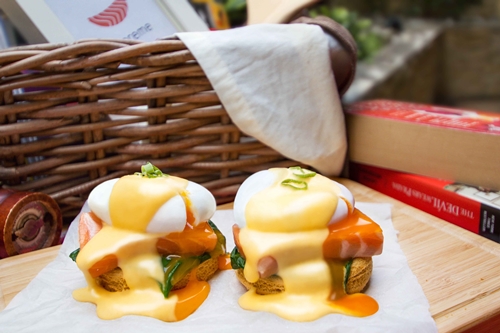 為營造春暖花開的料理手作氛圍,美威五星雙主廚黃燦庭(可樂)師傅、曾柏山(小山)師傅設計一系列適合野餐出遊、滿溢輕盈春之味道的料理課程,包括經典傳味的鮭魚班尼迪克蛋,主廚將澎鬆札實的厚片土司襯底,再鋪上翠綠新鮮的炒波菜、鮮甜滑潤的鮭魚、半熟水波蛋,佐以口感綿密、奶香四溢的特製荷蘭醬,劃破蛋包,蛋黃汁液緩緩流瀉,吃來濃稠滑順,色香味絕佳;另一道則是健康滿分、綠意盎然的醃製茴香小黃瓜鮭魚,盤中集結充滿茴香氣息的嫩鮭薄片、各色新鮮時蔬,宛若置身於美不勝收的春景中,嚐一口,恰到好處的清香滋味無可挑剔。