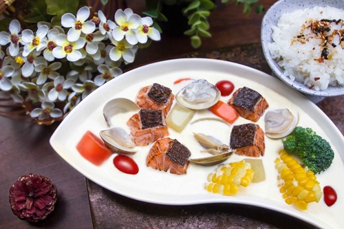 若鍾情日式口味的春日料理,可選擇帶有濃郁雋永滋味的北海道白醬奶油鮭魚飯料理課程,主廚將多彩鮮蔬、嫩鮭、蛤蜊等豐美食材燉煮至香氣撲鼻,海洋鮮味與綿密奶香融合之後,更能襯出鮭魚鮮甜滋味,餘韻無窮;另一道造型吸睛的鴨肝洋芋蟹肉綉球,則以洋芋、地瓜、香菇絲裹粉後包覆鴨肝、蟹肉,烘烤出滑順綿密的香氣,搭配乾烤後的香菇頗有嚼勁。而其他料理課程選擇如脆皮雞肉起士捲佐蘑菇醬汁燉飯、丹麥蘋果梅花豬、北海道干貝鮭魚明太子烏龍麵、海鮮洋芋玉米可樂餅亦是精彩萬分。