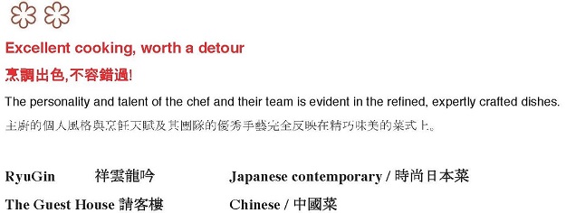 二星的殊榮則由日式時尚料理餐廳「祥雲龍吟」和中式餐廳「請客樓」獲得。請客樓以川揚菜為基礎的菜式融合本土味道,另米其林評審員欣賞的菜色包含香濃燉湯、麻油雞飯、紅麴豬尾、千層百頁豆腐等等,核桃棗煎餅更是特別推薦的料理。
