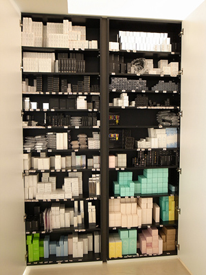 櫃子裡擺放一個個的收納盒,並可標註品牌方便尋找產品。