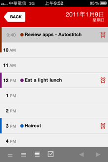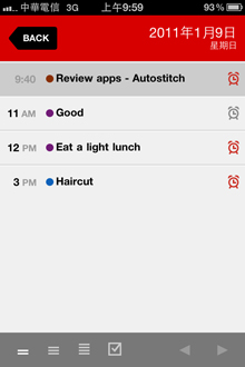 進入APP後直接來到當天的行事曆條列,比起內建行事曆將條列都放在同個畫面裡,Calvetica只將當天的項目列出來。左下選擇顯示方式,共有1)僅將事件列出,2)列出上班時間(8:00 am-5:00 pm),3)列出全部時間三種。