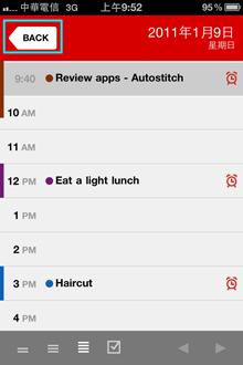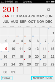 然後讓我們按「BACK」來到月份顯示區,每天的事項都用圓點來標記,如有導入不同的行事曆還可用不同顏色來區別,非常一目了然的格式方便安排工作行程與私人約會。若要切換到其他月份只要在上方點選不同月份,而要切換年份則是左右滑動年度即可,比起內建行事曆的左右切換月份方便多啦!但若要認真挑剔的話,能夠加上左右切換至下個月份或許更好,否則在從12月切至隔年1月時,總是要按兩種才可以到位。