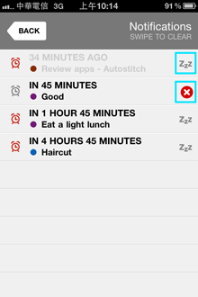 月份顯示畫面左下方有TODAY可以切到當天,免得你忘記今天是幾號;而右下方的NOTIFICATIONS非常值得一提,點入後可看到今天設定鬧鈴提示的行程,看到ZZZ的按鈕了嗎?這是Snooze(瞌睡鬧鐘)設定,如果在提示響起後又想再度設定延遲的響鈴,不需進入事件更改時間,只要在這邊做設定就可以再響一次!想要移除某事件的提示時,只要滑動項目再按X就可以了。不用一個一個事件分別檢視,而是把鬧鈴放在一起管理相當方便使用者整合!