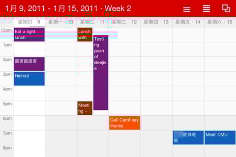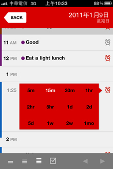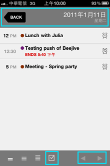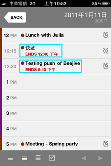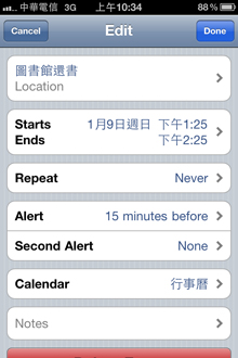 事件預設時間為一個小時,想更改事件時間長短及更多細部敘述,輕點事件就可進入操作,有點奇怪的是在這邊畫面變成跟內建行事曆一樣,而不是Calvetica風格的介面。而時間設定不是一個小時的事件,在條列顯示時會特別顯示結束的時間。