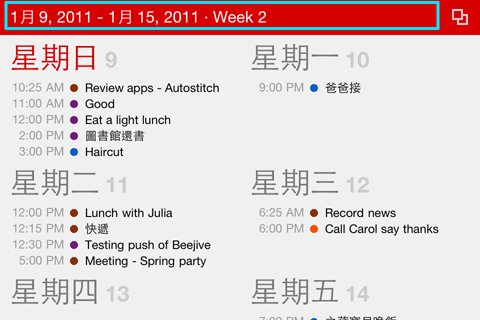 Calvetica另外一個貼心功能則是將你的iPhone轉為橫向,便會將你本週的行事曆通通根據時間長短列出,如果同個小時存在兩個以上的事件則會以並列的方式顯示。右上方可選擇顯示方式也有1)上班時間,2)全部時間,3)事件條列三種。在上方週次條列左右滑動可看其他週次,而想回到當週只要輕點條列即可。