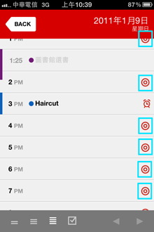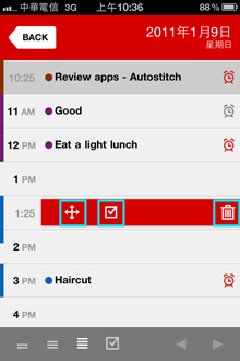 欲刪除事件也不需進入細部設定,只要輕滑列表中事件,便可用右方垃圾桶刪除。想將事件移到另外一個行事曆,則按中間的打勾小方框來選擇。將事件移到其他時間則是按十字箭頭,便可點選右方紅圈圈移到其他時間。這裡的小Bug是如果某個小時已經有事件存在,便無法直接移動,必須要到細部設定裡更改才行。