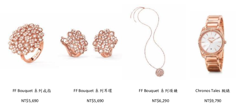 Folli Follie的FF Bouquet系列靈感來自翩然綻放的花朵,925純銀鍍以玫瑰金, 鑲嵌入方形切割的鋯石,帶來溫柔迷人的氣息,讓風象星座們更顯優雅,招來好桃花。而典雅的Chronos Tales系列腕錶,玫瑰金錶框帶有希臘古典風格的設計細節,可選擇玫瑰金鍊帶或是粉膚色皮革錶帶,手腕上一抹粉嫩的點綴,為戀愛運加持。