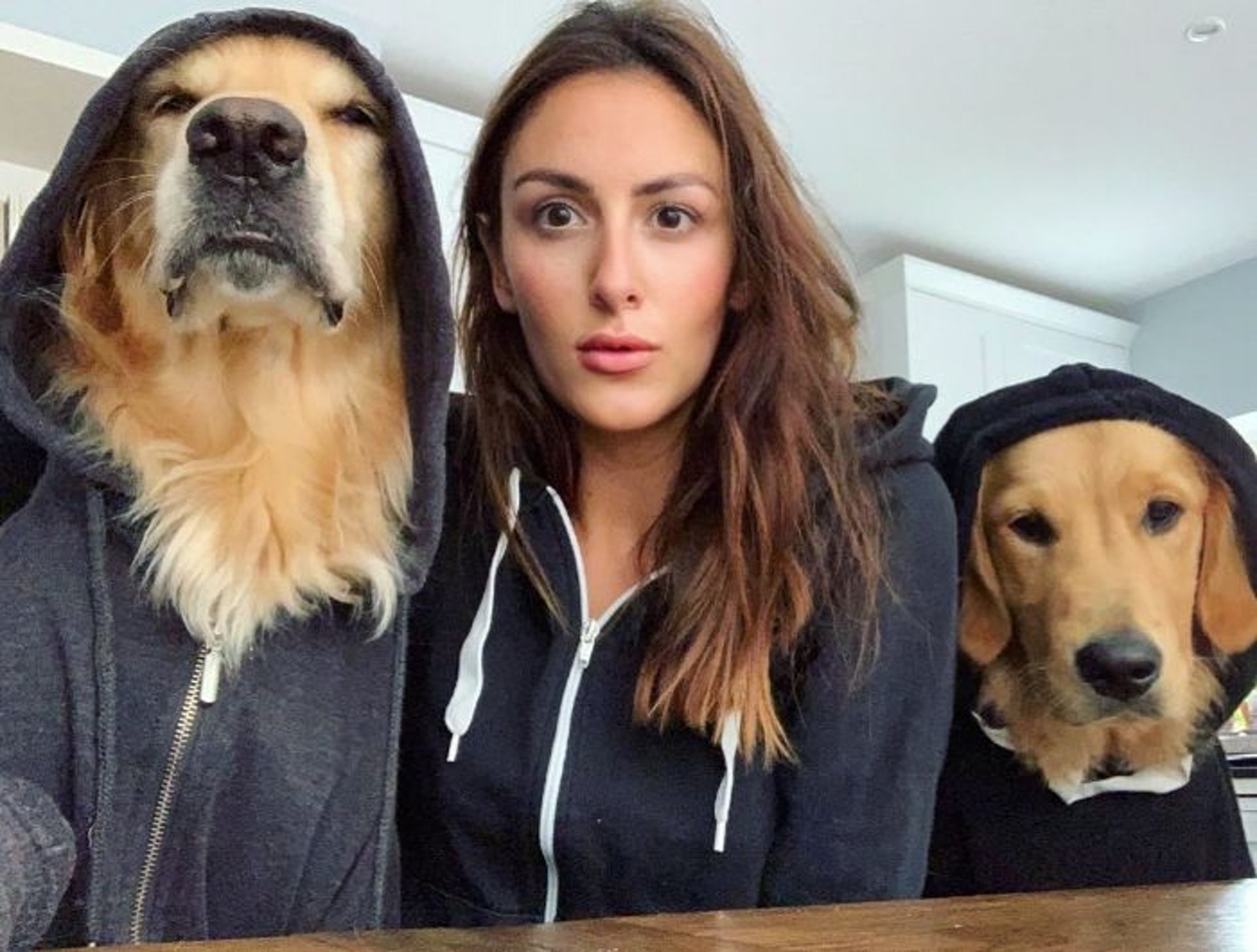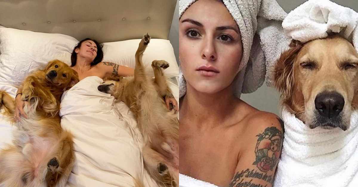 與兩隻大金毛犬同床,睡覺的位置立即變小了許多。平日Ursula在與狗狗一起合照時,最喜歡替金毛打扮成與自己一樣。