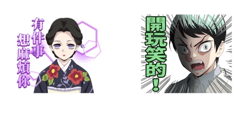 雖然在動畫中,鬼殺隊九柱的戲份並不多,但每個柱的名言在貼圖中也能看見,像是水柱富岡義勇的「別讓他人掌握你的生殺大權」、蟲柱胡蝶忍對同事(?)水柱說的「就是因為這樣才會被大家討厭喔」,到音柱在柱合會議時提出「華麗的反對」都被做成實用度滿分的貼圖啦!不知道蟲柱小姐姐的款式要在什麼時候使用呢?(笑)