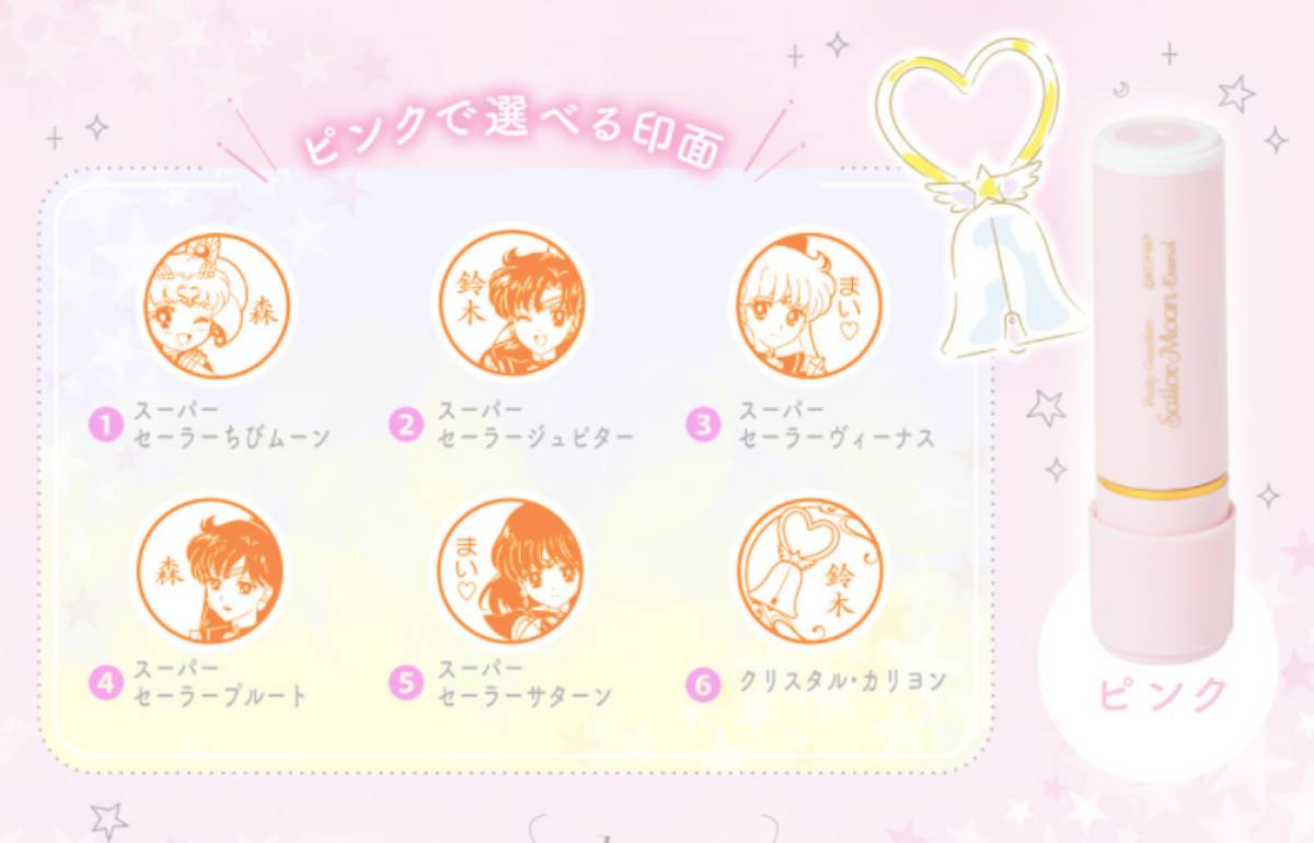 粉色款印面則有水手小月亮、水手木星、水手金星、水手冥王星與水手土星,以及用來呼喚天馬的「水晶聖鈴」,印章共2種系列、12款圖案,經典角色一次到齊,搭上自己的名字,真的可以完成變身夢呀!(笑)