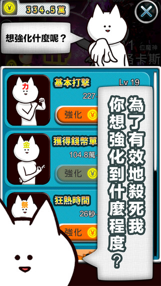 這個遊戲的每個關卡就是不斷的用「貓咪魔神」最害怕的蛋去攻擊,你可以透過吃錢幣累積各種實力,然後想盡辦法快速破那一個又一個、越來越無止盡的新關卡。