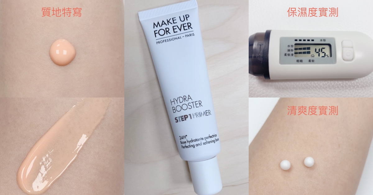 MAKE UP FOR EVER這支澎彈潤妝前乳保濕力很強!一擦在皮膚上就有滿滿的水潤感,能夠打造出帶有水光感的好膚質,很快吸收之後膚觸一直持續滋潤、保水力很好!使用後肌膚在視覺上有緊實拉提的感覺!(只上半邊臉測試真的很明顯喔!)特別推薦給乾燥不易上妝、彈力不佳的膚質使用。