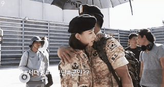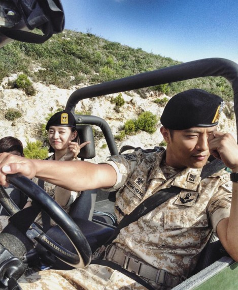 《太陽的後裔》中在試戲的「救援CP」金智媛和晉久,試完覺得very good還相互給個讚。