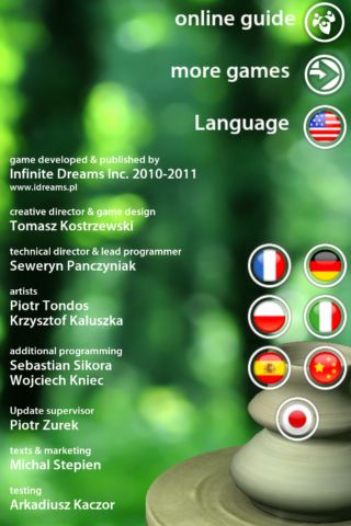 最後,介紹一下遊戲的說明頁,點選起始畫面的左下方,就可以修改遊戲語言(共支援英文、簡體中文、日文、法語、德語、西班牙語、義大利語及波蘭語等八種語言)、了解該公司出品的其他遊戲,或者連線到網路收看操作指南!