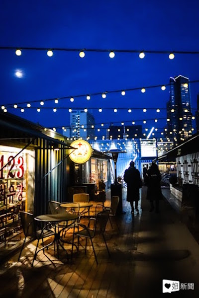 頂樓的餐廳區有許多異國料理,日式、西式甚至是中華料理都有,外頭走道間掛了點點黃燈點綴,映著藍色的貨櫃讓夜晚的景色非常浪漫,非常適合情人來這裡約會拍照。