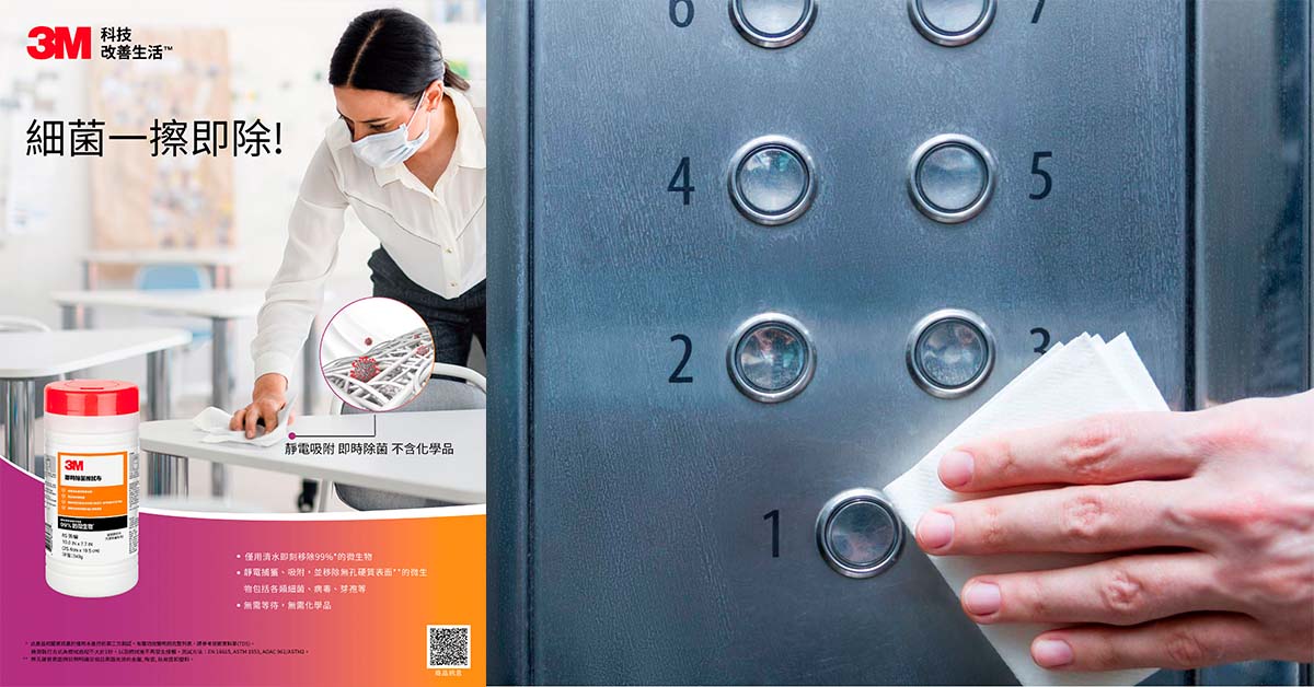 3M秉持「科技改善生活」的理念,為滿足民眾及專業人員對除菌產品更多樣化的需求,全新推出3M™ 即時除菌擦拭布,採用公司開發的獨特專有靜電吸附技術,將專有塗層塗佈在不織布上,使得擦拭布纖維上帶有正電荷、利用微生物在潮濕環境下通常帶有負電荷的原理,只要將擦拭布浸潤清水後,就能快速以靜電吸附、捕獲硬質無孔表面上99.9%包括引起COVID-19之新型冠狀病毒SARS-CoV-2、各類細菌、孢子、病毒…等,以物理性方式如同吸鐵般將微生物牢牢吸附於擦拭布中,避免交叉污染的可能性,且無需使用化學藥劑不會產生異味或刺激皮膚,用更輕鬆便捷的方式將細菌連根拔起,面面俱到解決各種除菌方式的痛點,是兼顧快速有效及方便舒適的除菌新選擇。