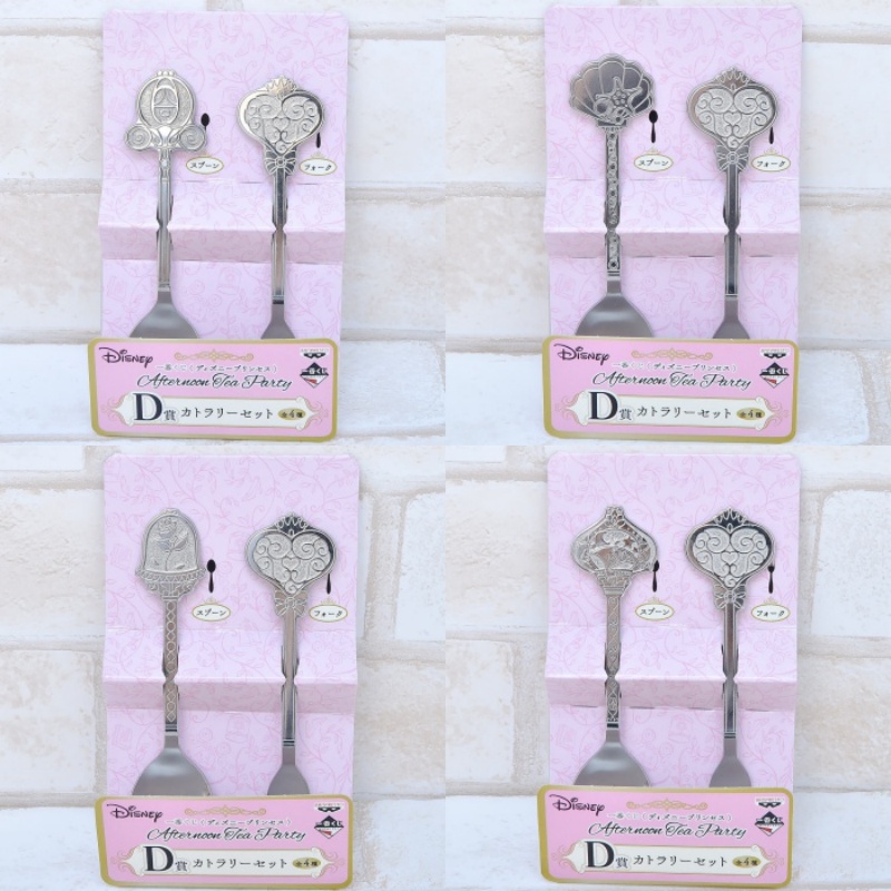 分別以南瓜馬車、貝殼、玫瑰玻璃罩、星空等元素分別代表灰姑娘、小美人魚、貝兒跟茉莉公主,每組餐具皆包含設計相當精緻的湯匙&叉子。