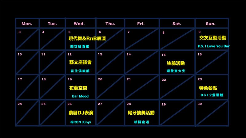 而經常利用音樂和酒客拉近距離的「榕RON Xinyi」,將會在1月底帶來一場音樂型態的表演,結合年節喜慶與70、80年代音樂,為即將到來的虎年提前慶祝。善於將曖昧融進酒單的「P.s. I Love You Bar」,更在1月9日舉辦的交友互動活動!另外還有藝文座談會、尾牙抽獎、花藝空間等等各種有趣的藝術展演,妞妞們絕對要看好時間去玩玩呀。