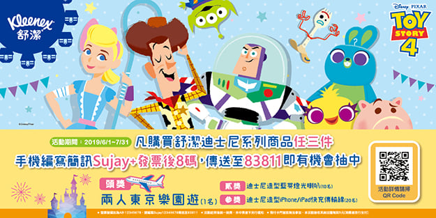 歡慶『玩具總動員4 X舒潔獨家聯名限量款系列』上市,即日起至7月底止舒潔品牌加碼推出迪士尼聯名系列消費簡訊抽獎活動,活動期間內凡消費者購買舒潔迪士尼商品任三件,依指示完成簡訊登錄即可參加抽獎,獎項內容包括頭獎兩人同遊東京迪士尼等。