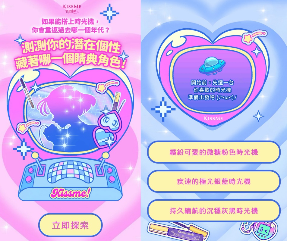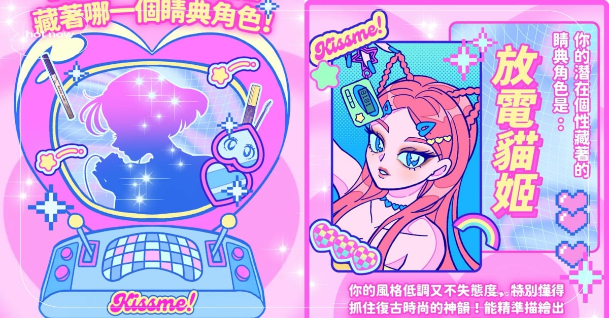 日本美妝品牌「KISSME花漾美姬」夢幻攜手台灣插畫家寬片片,打造出配合《KISSME睛典復刻運動》的主題心理測驗。以「y2k時光機」的概念貫穿核心,邀請大家重返過去的任一年代。只要回答7道題目,就可以測出潛在個性中隱藏著的睛典角色。現在就跟著妞編輯一起來看看吧~