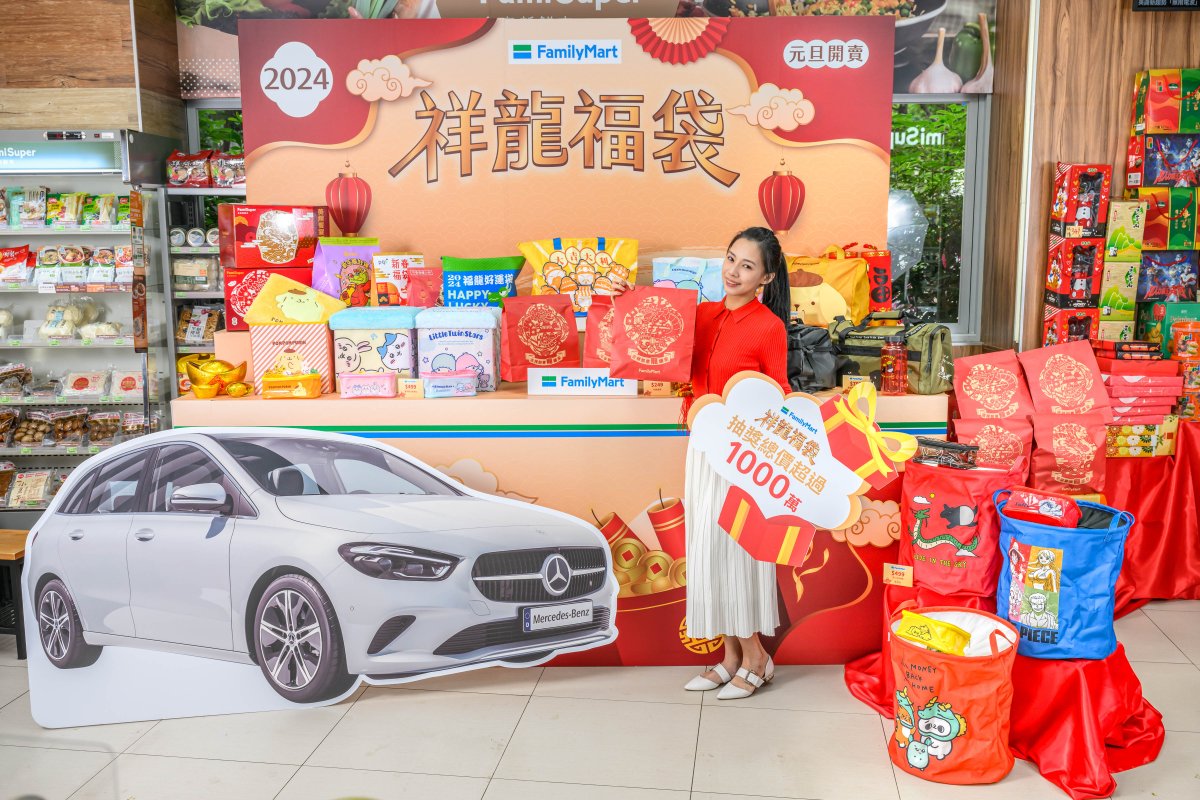 1月1日早上10點正式開賣的全家「2024年祥龍福袋」,內容物包含精選零食、飲料組合及專屬贈品外,每袋皆加贈60元至80元FamiCollection的冷藏飲品兌換券,今年更擴增授權商品、服飾等豐富品項納入隨袋贈品,福袋頭獎將送出5部THE NEW B-CLASS B180賓士車款,另外還有10萬元旅遊金、Switch、健身環大冒險等獎項!