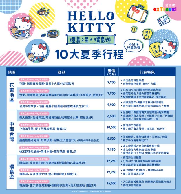 想搭乘今年最具話題性的「環島之星Hello Kitty繽紛列車」,明(7/4)日正式開行,購買環島之星行程商品即可體驗,熱門商品包含:花蓮自由行2天售價2,990元起,「環島之星˙環島遊 花蓮+墾丁3天」售價9,900元起,以上皆含飯店住宿,2人成行天天出發。另外,針對暑假出遊需求,另推出10大夏季行程,售價6,500元起,生態探索、夏日戲水、主題樂園、文化體驗等夏日必玩內容通通有,迎接暑假親子旅遊旺季,加碼祭出兒童不佔床免費優惠,歡迎大小朋友一起暢玩同遊,讓Hello Kitty陪你一起玩台灣!更多商品訊息請至易遊網官網