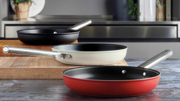 「義大利SMEG彩色不沾平底鍋」義大利製造,原裝進口,共有26cm、28cm、30cm三種尺寸,4.5mm專業級鋁製6層冷鍛鍋身,提供鍋具最佳的保熱性;特殊太陽紋專利造型鍋底設計,確保熱能均勻傳導,且堅固耐用不易變形,亮面不鏽鋼握把,以鉚釘與鍋身連結,非螺絲固定,不易鬆落,適用各種爐具,也能放入洗碗機清潔!