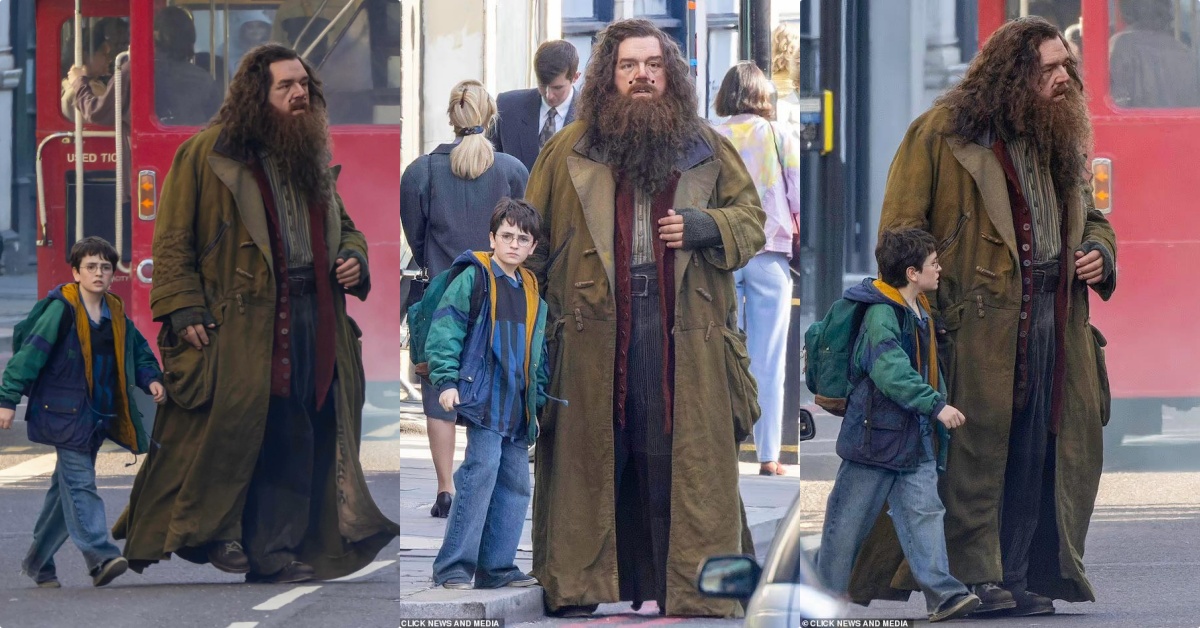 這會上預言家日報吧?英國出現多起「麻瓜目擊事件」,疑似看到超過身高250CM的巨人大搖大擺出沒在街頭(笑),沒錯!《哈利波特》影集正在位於倫敦的同一個電影拍攝地取景,人群中一眼就可以看到飾演「獵場看守員」的魯霸海格一角的尼克佛洛斯特(Nick Frost),正帶著新版哈利Dominic McLaughlin 穿梭在街上。