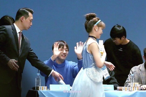 成員尹智聖看到這位少女粉絲時還有點不知所措,用非常覺得可愛的眼神看著她,在收到尹智聖的簽名之後,這位少女就默默地離開了。